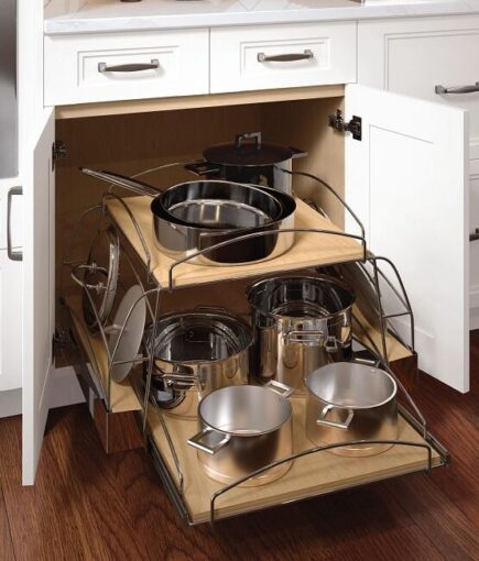 - Pantry storage with pull-outs that easily bring your items out to you will not only provide more space, but will also save your knees and back from stooping and reaching to access those items